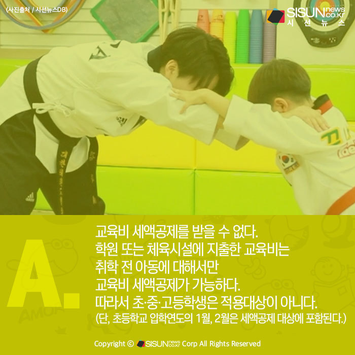 초등학생 자녀의 학원비와 태권도장 수강료에 대해 교육비 세액공제를 받을 수 있을까? 교육비 세액공제를 받을 수 없다. 학원 또는 체육시설에 지출한 교육비는 취학 전 아동에 대해서만 교육비 세액공제가 가능하다. 따라서 초/중/고등학생은 적용대상이 아니다. 단, 초등학교 입학연도의 1월, 2월은 세액공제 대상에 포함된다.