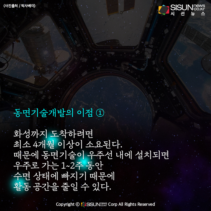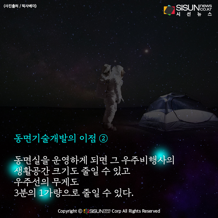 [시선뉴스 박진아, 이시연 수습기자/ 디자인 최지민] 간혹 영화를 보다 보면 우주비행사들이 지구를 떠나 우주에 도착할 때까지 잠을 자는 장면이 나오곤 한다. 이에 유럽우주국 우주 환경과학팀은 “공상 영화에서나 나올법한 우주 비행사들의 동면이 현실화 될 가능성이 높아지고 있다“고 분석했다.