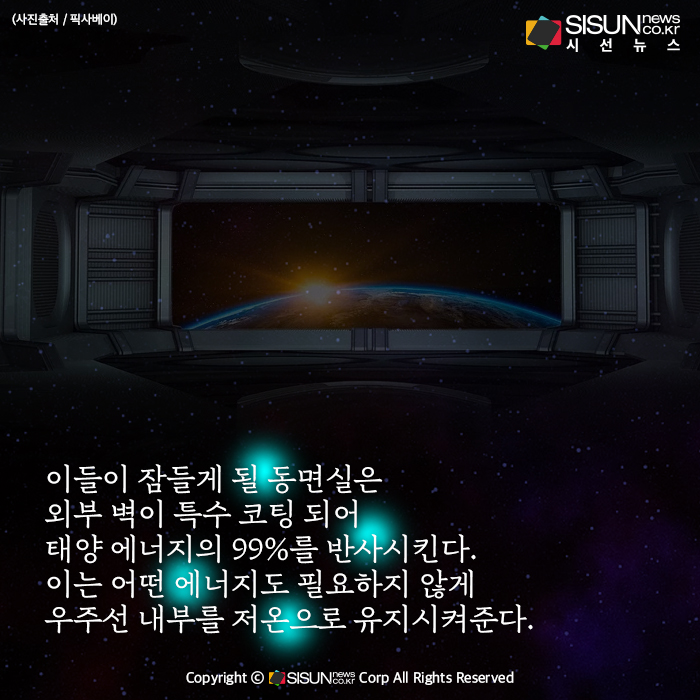 이들이 잠들게 될 동면실은 외부 벽이 특수 코팅 되어 있어 태양 에너지의 99%를 반사시키는 기능을 하게 된다. 이는 어떤 에너지도 필요로 하지 않고 우주 자체의 극저온을 그대로 이어 받아 동면실 내부 온도를 영하 148도로 유지시킬 수 있다.