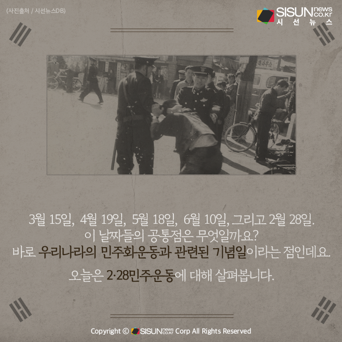 3월 15일, 4월 19일, 5월 18일, 6월 10일, 그리고 2월 28일. 이 날짜들의 공통점은 무엇일까요? 바로 우리나라의 민주화운동과 관련된 기념일이라는 점인데요. 오늘은 2·28민주운동에 대해 살펴봅니다.