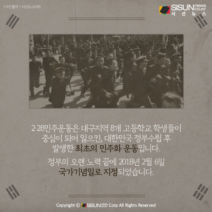 2·28민주운동은 대구지역 8개 고등학교 학생들이 중심이 되어 일으킨, 대한민국 정부수립 후 발생한 최초의 민주화 운동입니다. 정부의 오랜 노력 끝에 2018년 2월 6일 국가기념일로 지정되었습니다.