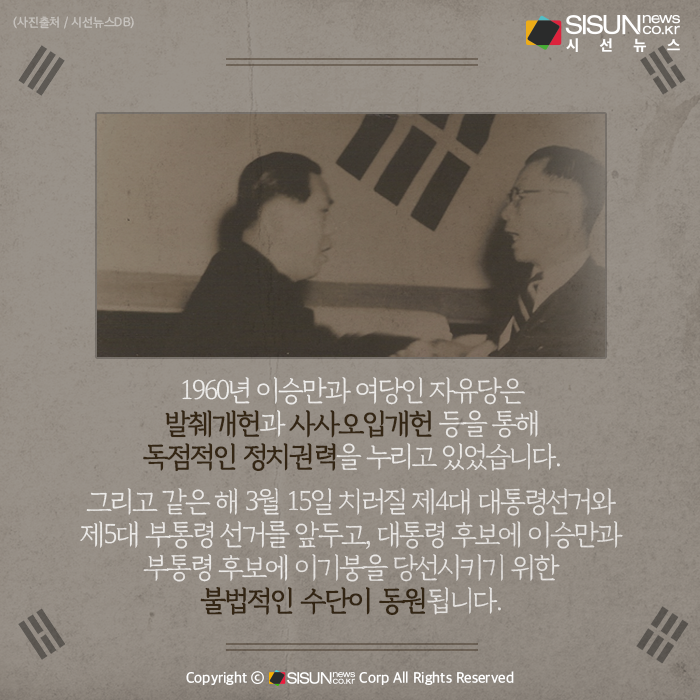 1960년 이승만과 여당인 자유당은 발췌개헌과 사사오입개헌 등을 통해 독점적인 정치권력을 누리고 있었습니다. 그리고 같은 해 3월 15일 치러질 제4대 대통령선거와 제5대 부통령 선거를 앞두고, 대통령 후보에 이승만과 부통령 후보에 이기붕을 당선시키기 위한 불법적인 수단이 동원됩니다.