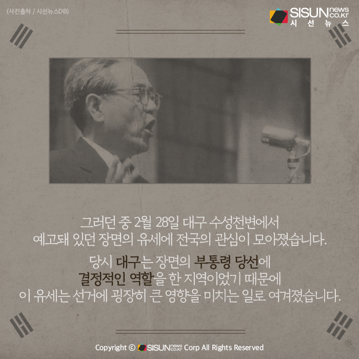 그러던 중 2월 28일 대구 수성천변에서 예고돼 있던 장면의 유세에 전국의 관심이 모아졌습니다. 당시 대구는 장면의 부통령 당선에 결정적인 역할을 한 지역이었기 때문에 이 유세는 선거에 굉장히 큰 영향을 미치는 일로 여겨졌습니다. 따라서 이승만 정권은 2월 28일 예고된 장면의 유세에 시민들이 나가지 못하도록 부당한 지시를 합니다.