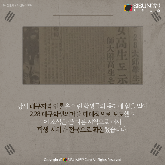 당시 대구지역 언론은 어린 학생들의 용기에 힘을 얻어 2.28 대구학생의거를 대대적으로 보도했고 이 소식은 곧 다른 지역으로 퍼져 학생 시위가 전국으로 확산됐습니다. 부정부패와 독재권력에 대항한 학생들의 시위는 시민들의 지지에 힘입어 3.15마산의거가 되었고, 훗날 5.18민주화 운동의 기반이 됐습니다. 부당함 아래에서도 정의와 자유를 갈망했던 학생들의 용기는, 민주주의를 향한 불꽃으로 역사 속에 남았습니다.