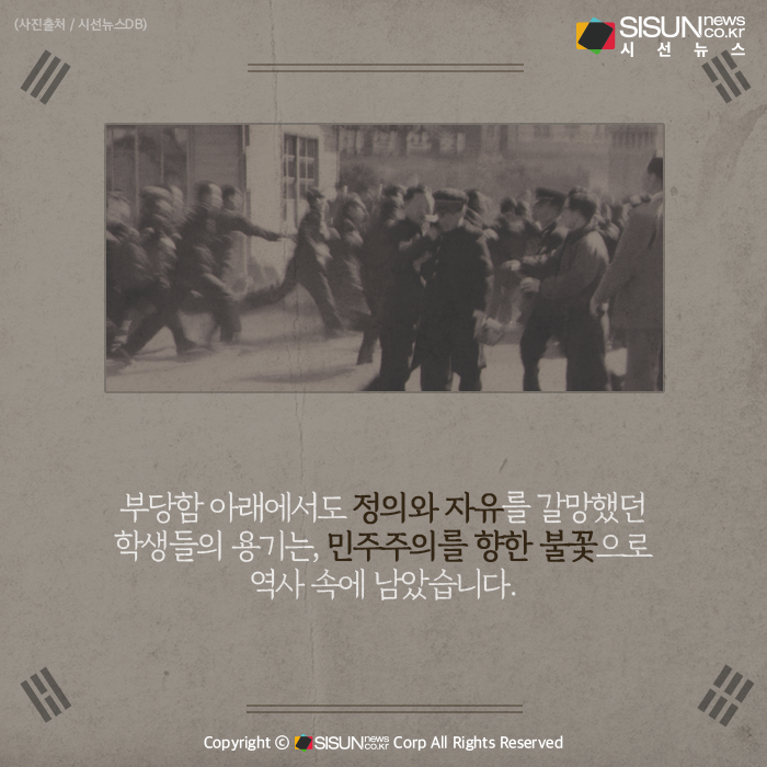 교사들의 만류에도 불구하고 학교를 뛰쳐나온 학생들은 지난 30여 년간 자행된 자유당 정권의 불의와 부정, 독재를 규탄하고 민족문제, 민중생존 문제에 대해 발언하며 시위를 이어갔습니다. 마침내 대한민국 정부 수립 이후 최초의 반독재 민주화 운동이 시작된 것입니다.
