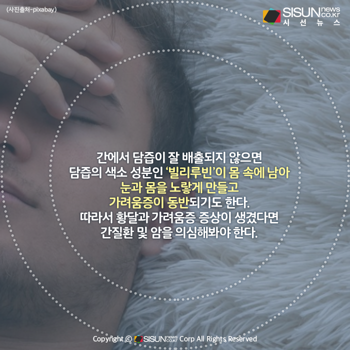 암이 발생하면 생성되는 물질인 ‘인터루킨’ 라는 물질은 간에 작용해 담즙 분비 현상에 방해를 주는 것으로 추정된다. 간에서 담즙이 잘 배출되지 않으면 담즙의 색소 성분인 ‘빌리루빈’이 몸 속에 남아 눈과 몸을 노랗게 만들고 가려움증이 동반되기도 한다. 따라서 황달과 가려움증 증상이 생겼다면 간질환 및 암을 의심해봐야 한다.