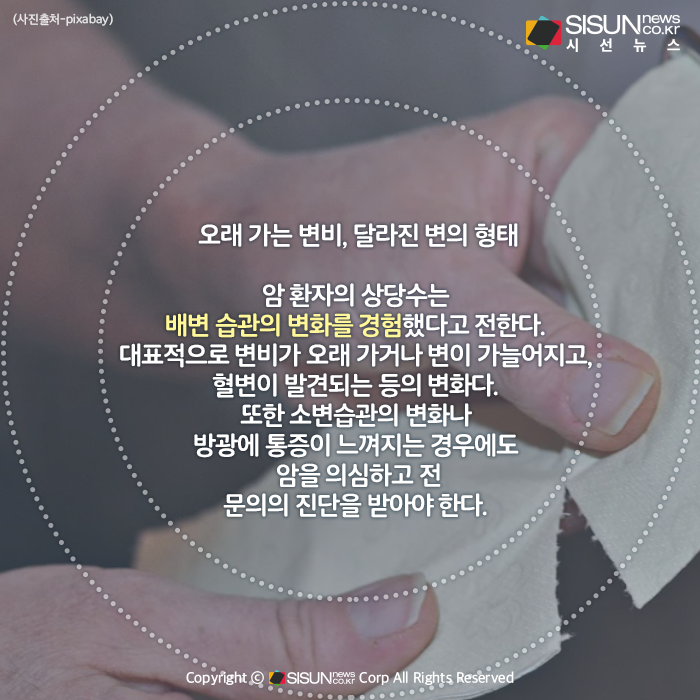 암 환자의 상당수는 배변 습관의 변화를 경험했다고 전한다. 대표적으로 변비가 오래 가거나 변이 가늘어지고, 혈변이 발견되는 등의 변화다. 또한 소변습관의 변화나 방광에 통증이 느껴지는 경우에도 암을 의심하고 전문의의 진단을 받아야 한다.