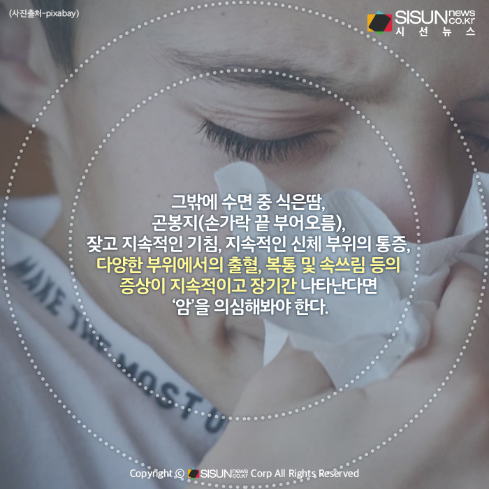그밖에 수면 중 식은땀, 곤봉지(손가락 끝 부어오름), 잦고 지속적인 기침, 지속적인 신체 부위의 통증, 다양한 부위에서의 출혈, 복통 및 속쓰림 등의 증상이 지속적이고 장기간 나타난다면 ‘암’을 의심해봐야 한다. 오랜 기간 인류을 위협해오고 있는 암. 2019년 조사에서 역시 암은 사망원인 1위를 기록했다. 발견 시기에 따라 생명을 앗아가기도 하는 암 예방을 위해 전조 증상이 보내는 신호에 세심히 관심을 가져야 할 것이다.
