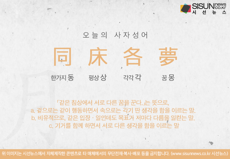 오늘의 사자성어 동상각몽[同床各夢]입니다.