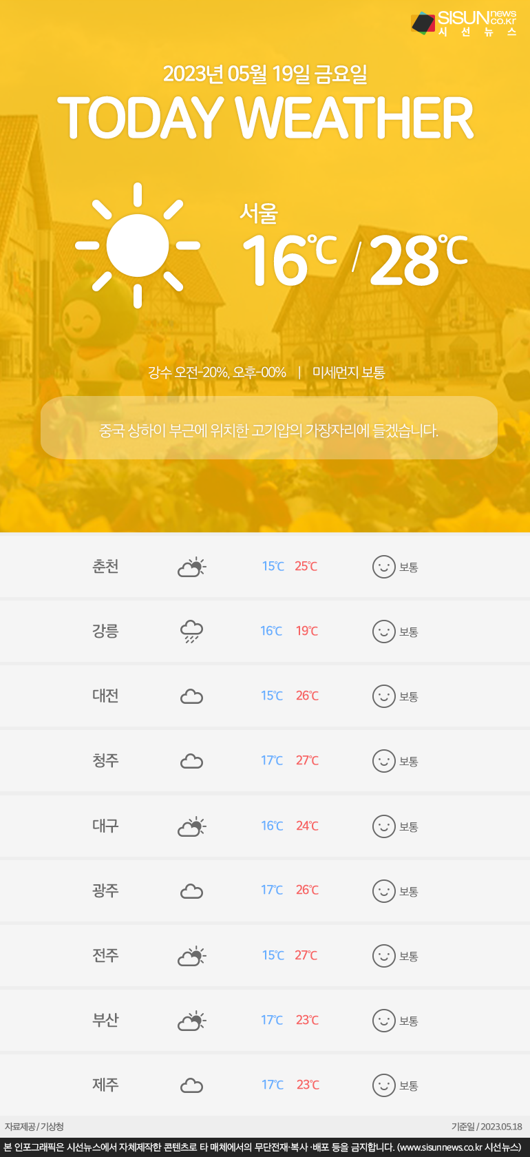 [서울] 최저기온 : 16 / 최고기온 : 28 / 미세먼지 : 보통