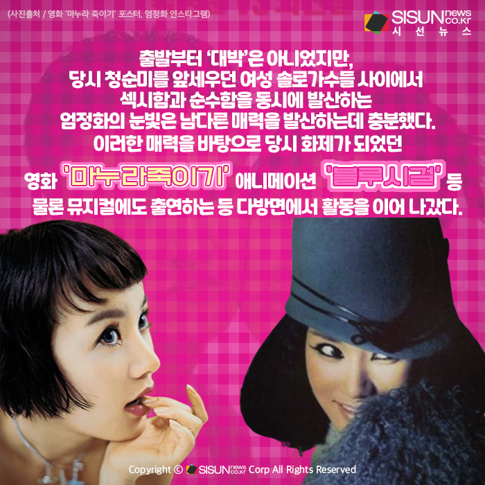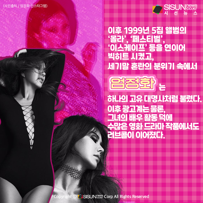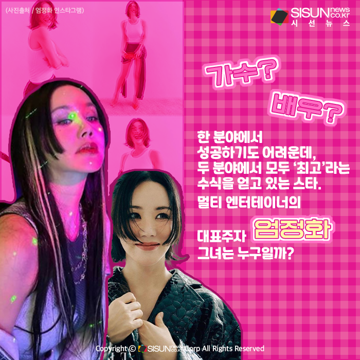 시선뉴스=심재민 기자 / 디자인=이윤아Pro | 가수와 배우. 한 분야에서 성공하기도 어려운데, 두 분야에서 모두 ‘최고’라는 수식을 얻고 있는 스타. 멀티 엔터테이너의 대표주자 엄정화에 대해 알아보자.