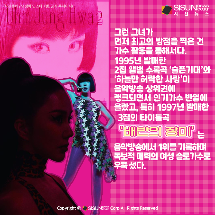 그런 그녀가 먼저 최고의 방점을 찍은 건 가수 활동을 통해서다. 1995년 발매한 2집 앨범 수록곡 ‘슬픈기대’와 ‘하늘만 허락한 사랑’이 음악방송 상위권에 랭크되면서 인기가수 반열에 올랐고, 특히 1997년 발매한 3집의 타이틀곡 ‘배반의 장미’는 음악방송에서 1위를 기록하며 독보적 매력의 여성 솔로가수로 우뚝 섰다.