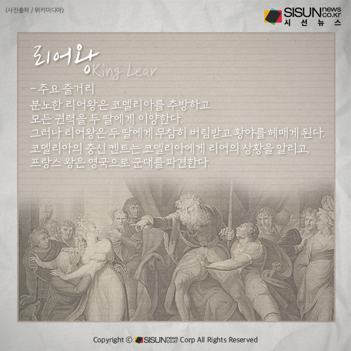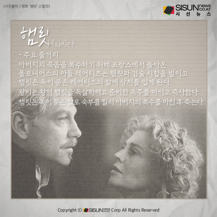 시선뉴스=조재휘 기자 / 디자인=이윤아Proㅣ세계 최고의 극작가로 칭송받는 셰익스피어. 여러 분야의 작품을 다양하게 발표했으며 뛰어난 재능을 발휘하면서 많은 관객의 마음을 사로잡았다. 셰익스피어는 영국의 자존심으로도 불리며 영국 사람들에게 절대적인 존경을 받고 있기도 하다. 그의 많은 작품이 오늘날까지 엄청난 사랑을 받는 가운데 지금부터 셰익스피어의 4대 비극에 대해 알아보자.