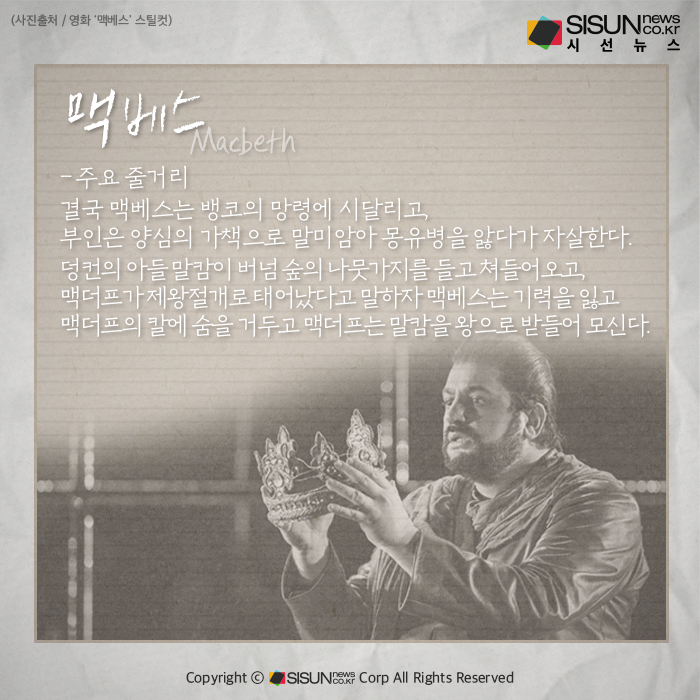 다음 <맥베스>는 4대 비극 가운데 가장 짧은 작품으로 군더더기 없는 탄탄한 짜임새와 전편에 일관되게 흐르는 긴장은 다른 어느 작품에서도 볼 수 없는 특색이다. 용맹한 장군이자 야심가인 맥베스가 마녀의 사주를 받아 자기가 섬기는 왕을 살해하고 왕위를 찬탈한다는 내용의 작품이다.