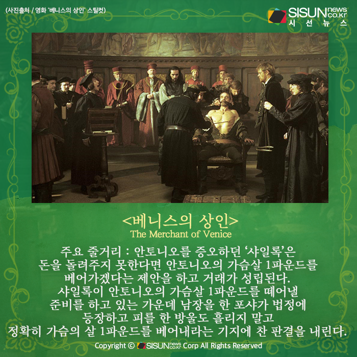 먼저 <베니스의 상인>은 셰익스피어의 여러 희곡 중 가장 인기를 끈 작품이다. 이탈리아 소설에서 취재한 작품으로 5막으로 구성된 극으로 1596년경에 집필되었으며 1600년에 초판 되었다. 재판의 형식을 도입하여 인물들의 대립적인 생각과 삶의 태도를 뚜렷하게 드러내고 있으며, 인간성에 대한 통찰이 깊고 정확하다는 점에서 높은 평가를 받고 있다.