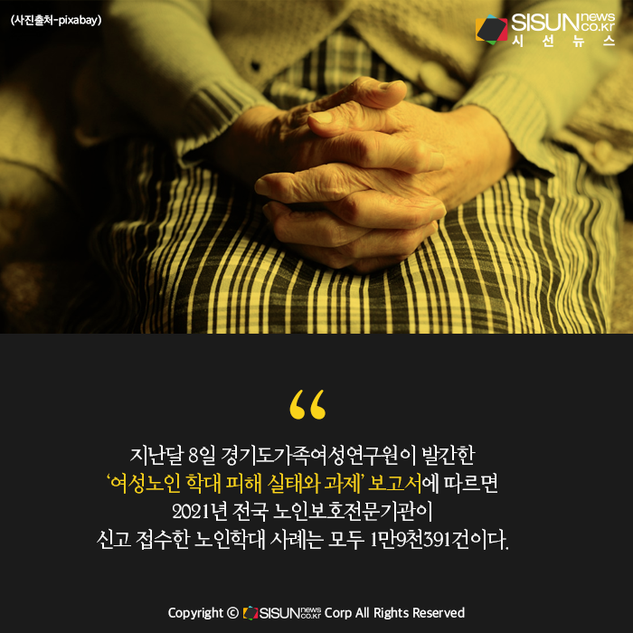 시선뉴스=박진아 기자 / 디자인=김선희 수습ㅣ지난달 8일 경기도가족여성연구원이 발간한 ‘여성노인 학대 피해 실태와 과제’ 보고서에 따르면 2021년 전국 노인보호전문기관이 신고 접수한 노인학대 사례는 모두 1만9천391건이다.