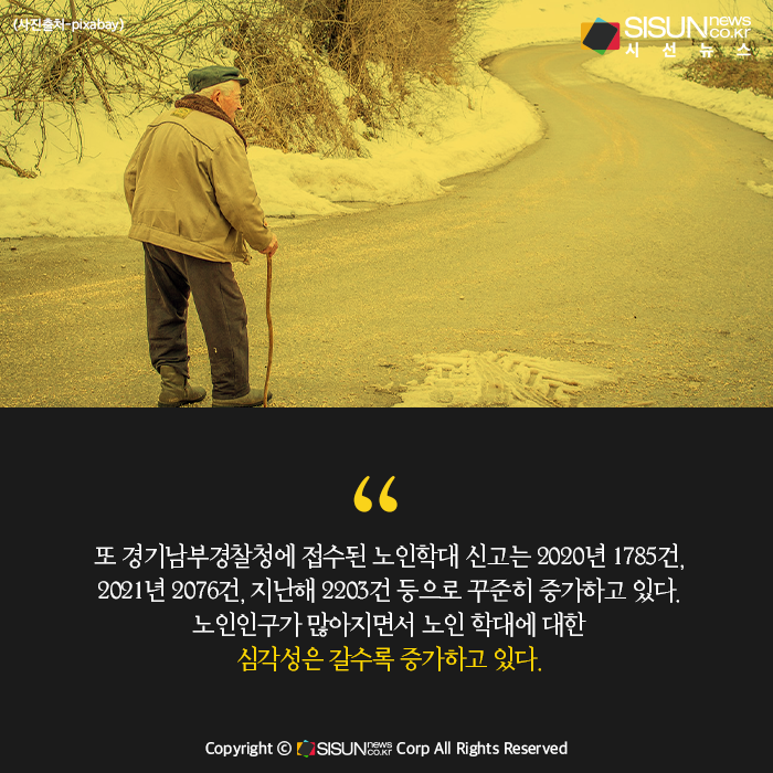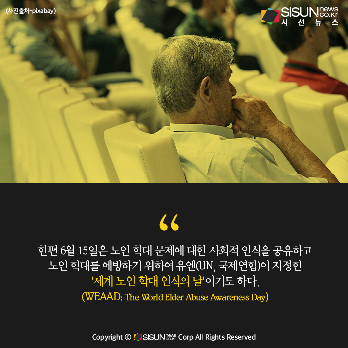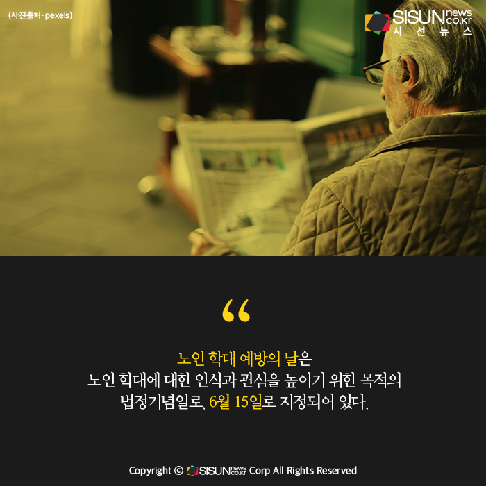 또 경기남부경찰청에 접수된 노인학대 신고는 2020년 1785건, 2021년 2076건, 지난해 2203건 등으로 꾸준히 증가하고 있다. 노인인구가 많아지면서 노인 학대에 대한 심각성은 갈수록 증가하고 있다. 노인 학대에 대한 인식이 절실한 지금, 노인 학대 예방의 날에 대해 알아보자.