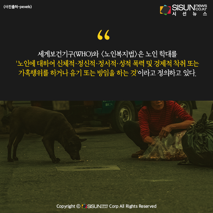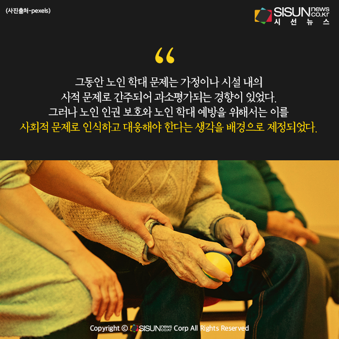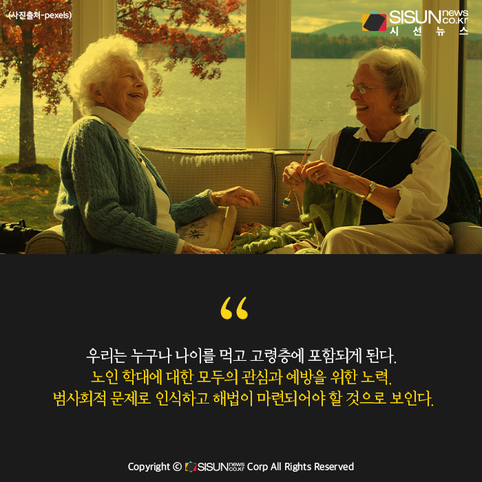 백세인생을 외치는 사회. 고령화 사회 증가는 뚜렷해지고 있다. 우리는 누구나 나이를 먹고 고령층에 포함되게 된다. 노인 학대에 대한 모두의 관심과 예방을 위한 노력. 범사회적 문제로 인식하고 해법이 마련되어야 할 것으로 보인다.