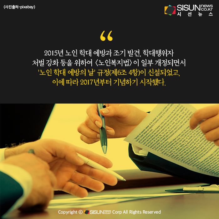 2015년 노인 학대 예방과 조기 발견, 학대행위자 처벌 강화 등을 위하여 <노인복지법>이 일부 개정되면서 '노인 학대 예방의 날' 규정(제6조 4항)이 신설되었고, 이에 따라 2017년부터 기념하기 시작했다.