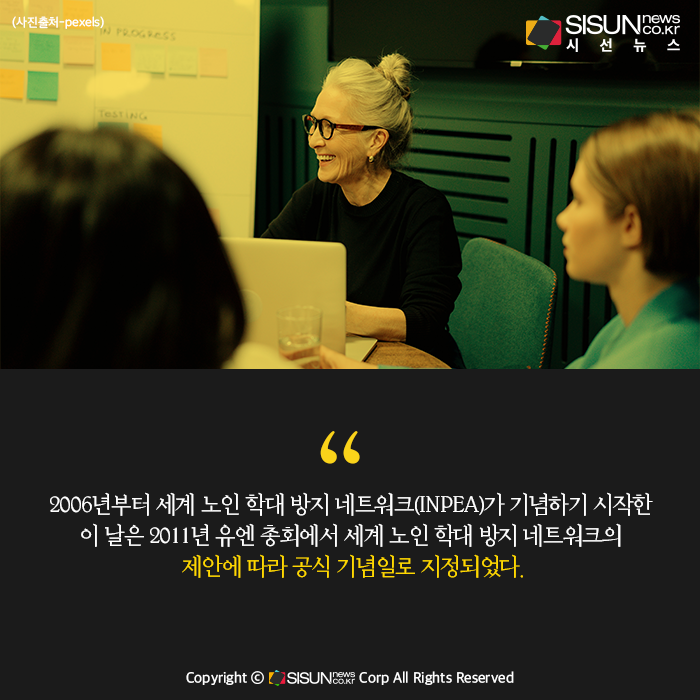 한편 6월 15일은 노인 학대 문제에 대한 사회적 인식을 공유하고 노인 학대를 예방하기 위하여 유엔(UN, 국제연합)이 지정한 '세계 노인 학대 인식의 날(WEAAD; The World Elder Abuse Awareness Day)'이기도 하다. 2006년부터 세계 노인 학대 방지 네트워크(INPEA)가 기념하기 시작한 이 날은 2011년 유엔 총회에서 세계 노인 학대 방지 네트워크의 제안에 따라 공식 기념일로 지정되었다.