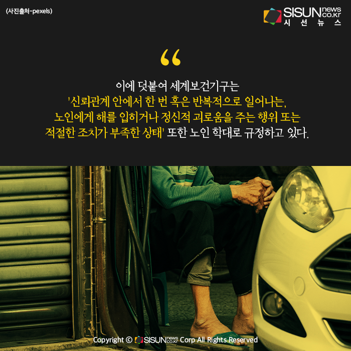 세계보건기구(WHO)와 <노인복지법>은 노인 학대를 '노인에 대하여 신체적·정신적·정서적·성적 폭력 및 경제적 착취 또는 가혹행위를 하거나 유기 또는 방임을 하는 것'이라고 정의하고 있다. 이에 덧붙여 세계보건기구는 '신뢰관계 안에서 한 번 혹은 반복적으로 일어나는, 노인에게 해를 입히거나 정신적 괴로움을 주는 행위 또는 적절한 조치가 부족한 상태' 또한 노인 학대로 규정하고 있다.