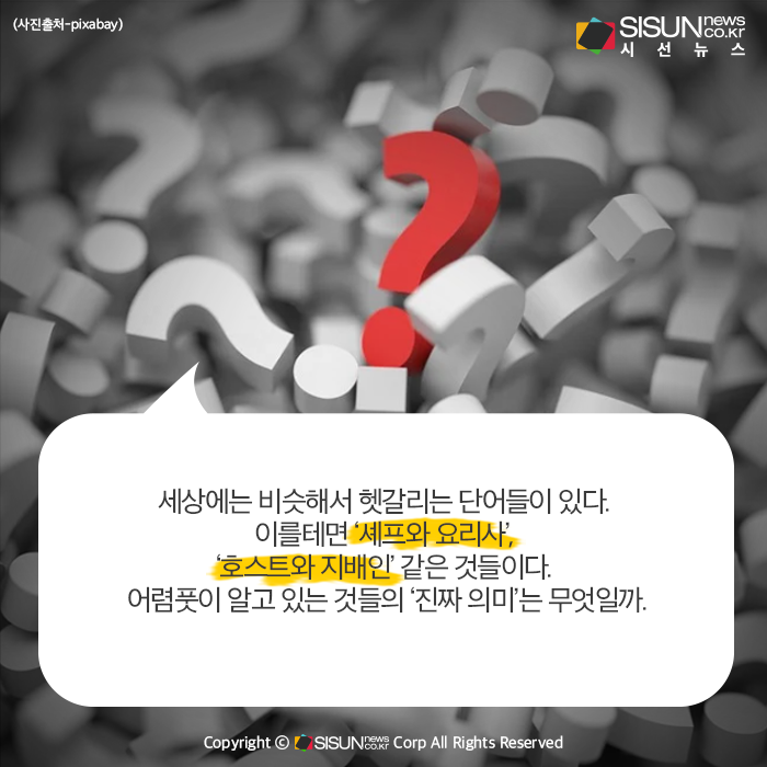시선뉴스=정혜인 수습 기자ㅣ세상에는 다른 의미를 가지고 있지만 쓰임새가 비슷해서 어떨 때 사용하는 말인지 헷갈리는 단어들이 있다. 이를테면 ‘셰프와 요리사’, ‘호스트와 지배인’ 같은 것들이다. 자신이 종종 사용하는 말이어도 그 말의 명확한 뜻은 모르는 경우가 더 많다. 어렴풋이 알고 있는 단어들의 ‘진짜 의미’는 무엇일까.