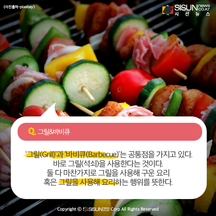 ‘그릴(Grill)’과 ‘바비큐(Barbecue)’는 공통점을 가지고 있다. 바로 그릴(석쇠)를 사용한다는 것이다. 둘 다 마찬가지로 그릴을 사용해 구운 요리 혹은 그릴을 사용해 요리하는 행위를 뜻한다. 다만 서로 다른 요리방식을 사용한다. 바비큐는 주로 돼지나 소와 같은 고기를 ‘통째로 굽는’ 요리이고, 그릴은 ‘그릴에 굽는’ 모든 요리이다. 원래는 바비큐라는 단어가 고기류에만 해당되었지만 최근에는 그릴처럼 생선, 채소, 과일 등에 사용되기도 한다.