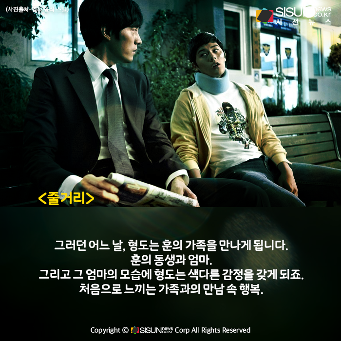 문제는 그때부터. 한 번도 그런적 없던 지형도는 훈과의 임무 수행 중 처음 느껴보는 감정을 갖게 됩니다. 순간의 망설임을 느낀 그는 임무를 완수하지 못하고, 처음으로 회사의 뜻을 거스르게 되죠. 그러던 어느 날, 형도는 훈의 가족을 만나게 됩니다. 훈의 동생과 엄마. 그리고 그 엄마의 모습에 형도는 색다른 감정을 갖게 되죠. 처음으로 느끼는 가족과의 만남 속 행복.