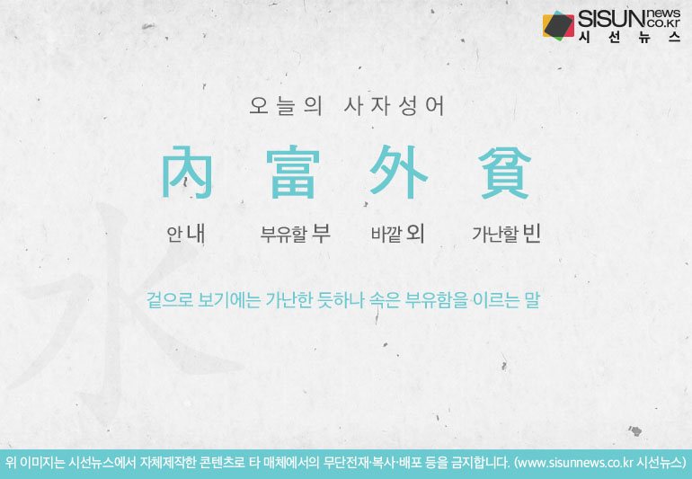 [안 내, 부유할 부, 바깥 외, 가난할 빈]의 글자로 만들어진 사자성어 내부외빈은 겉으로 보기에는 가난한 듯하나 속은 부유함을 이르는 말입니다.