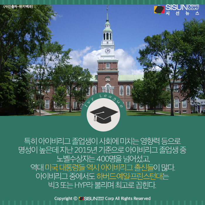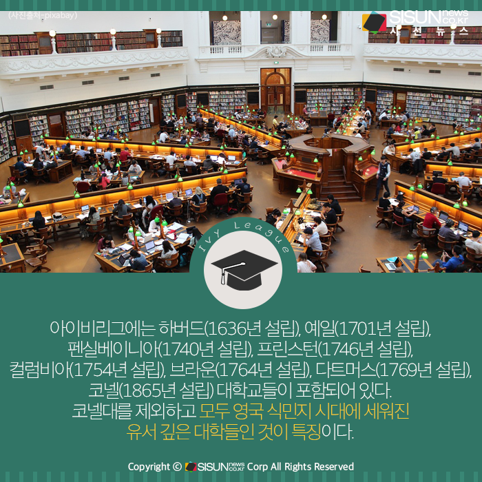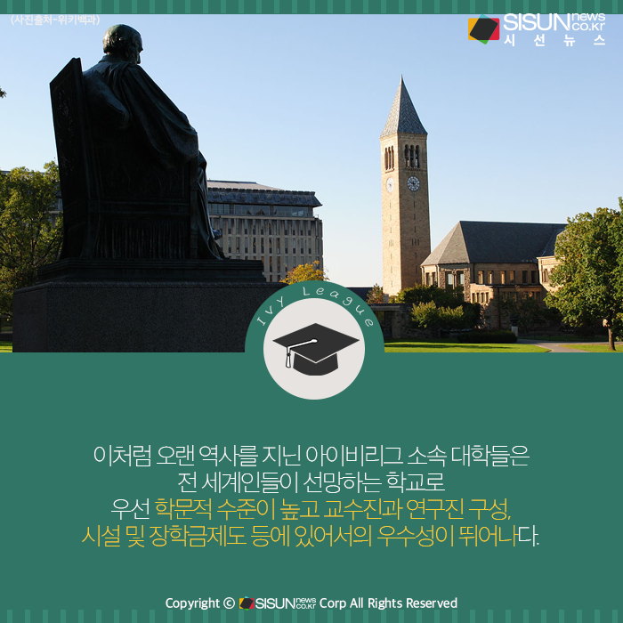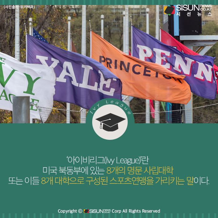 ‘아이비리그(Ivy League)’란 미국 북동부에 있는 8개의 명문 사립대학 또는 이들 8개 대학으로 구성된 스포츠연맹을 가리키는 말이다. 아이비리그에는 하버드(1636년 설립), 예일(1701년 설립), 펜실베이니아(1740년 설립), 프린스턴(1746년 설립), 컬럼비아(1754년 설립), 브라운(1764년 설립), 다트머스(1769년 설립), 코넬(1865년 설립) 대학교들이 포함되어 있다. 코넬대를 제외하고 모두 영국 식민지 시대에 세워진 유서 깊은 대학들인 것이 특징이다.