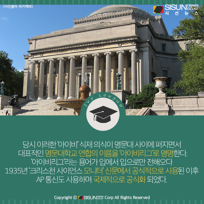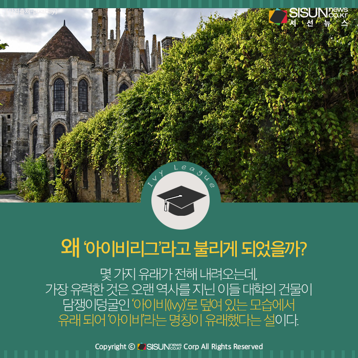 왜 ‘아이비리그’라고 불리게 되었을까? 몇 가지 유래가 전해 내려오는데, 가장 유력한 것은 오랜 역사를 지닌 이들 대학의 건물이 담쟁이덩굴인 ‘아이비(Ivy)’로 덮여 있는 모습에서 유래 되어 ‘아이비’라는 명칭이 유래했다는 설이다.