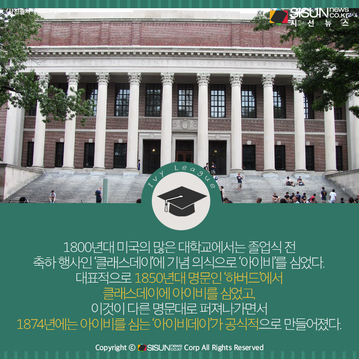 1800년대 미국의 많은 대학교에서는 졸업식 전 축하 행사인 ‘클래스데이’에 기념 의식으로 ‘아이비’를 심었다. 대표적으로 1850년대 명문인 ‘하버드’에서 클래스데이에 아이비를 심었고, 이것이 다른 명문대로 퍼져나가면서 1874년에는 아이비를 심는 ‘아이비데이’가 공식적으로 만들어졌다.