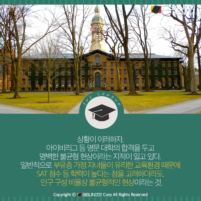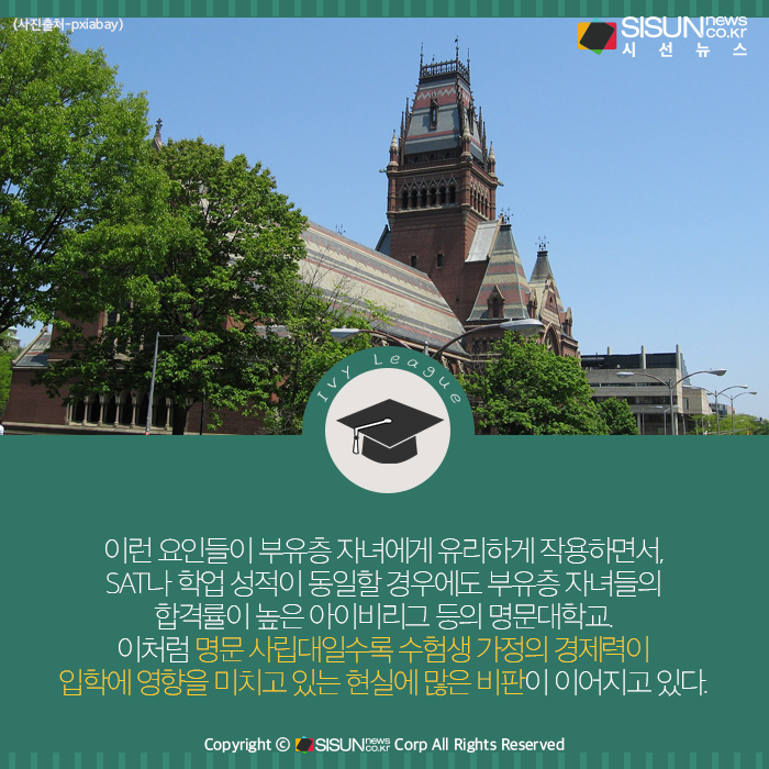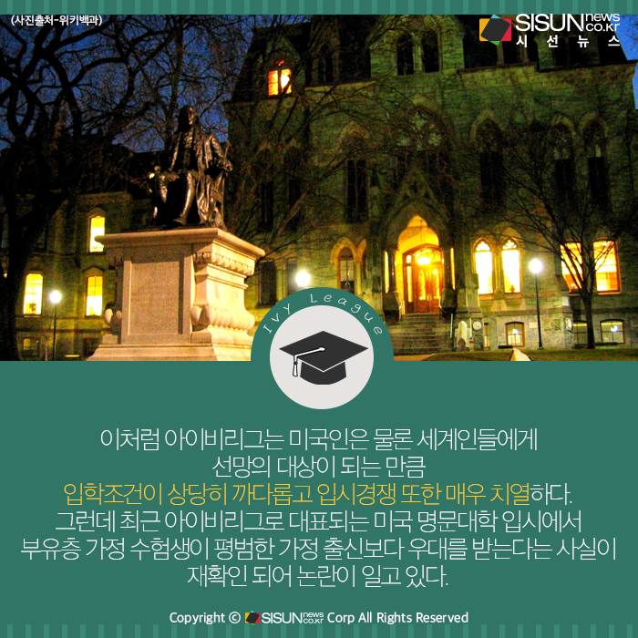 시선뉴스=심재민 기자 | ‘아이비리그’로 대표되는 미국 명문대학 입시에서 부유층 가정 수험생이 평범한 가정 출신보다 우대를 받는다는 사실이 재확인되어 비판이 일고 있다.