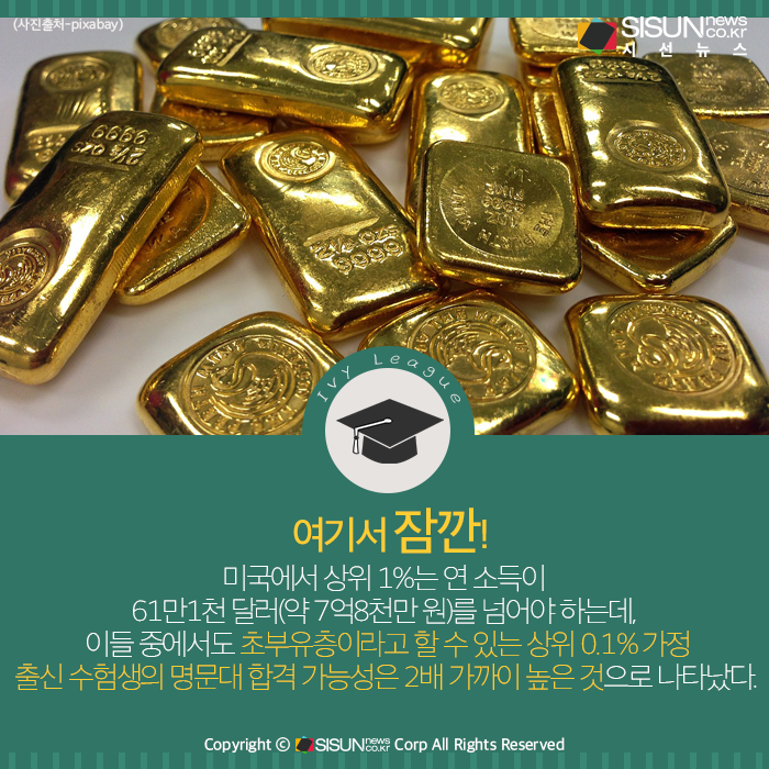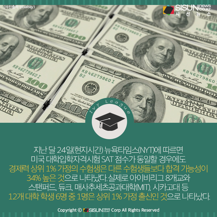 지난 달 24일(현지시간) 뉴욕타임스(NYT)에 따르면 미국 대학입학자격시험 SAT 점수가 동일할 경우에도 경제력 상위 1% 가정의 수험생은 다른 수험생들보다 합격 가능성이 34% 높은 것으로 나타났다. 실제로 아이비리그 8개교와 스탠퍼드, 듀크, 매사추세츠공과대학(MIT), 시카고대 등 12개 대학 학생 6명 중 1명은 상위 1% 가정 출신인 것으로 나타났다. 미국에서 상위 1%는 연 소득이 61만1천 달러(약 7억8천만 원)를 넘어야 하는데, 이들 중에서도 초부유층이라고 할 수 있는 상위 0.1% 가정 출신 수험생의 명문대 합격 가능성은 2배 가까이 높은 것으로 나타났다.