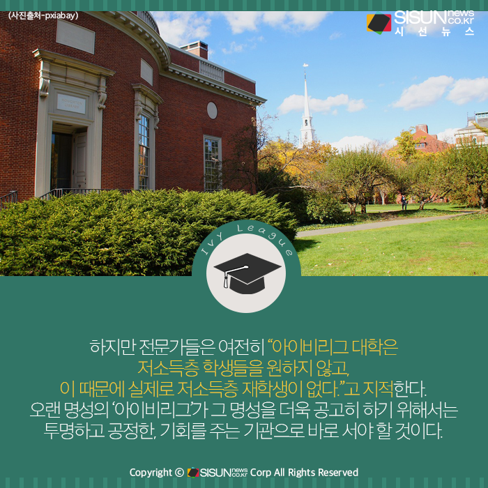 하지만 전문가들은 여전히 "아이비리그 대학은 저소득층 학생들을 원하지 않고, 이 때문에 실제로 저소득층 재학생이 없다.“고 지적한다. 오랜 명성의 ‘아이비리그’가 그 명성을 더욱 공고히 하기 위해서는 투명하고 공정한, 누구에게나 기회를 주는 기관으로 바로 서야 할 것이다.