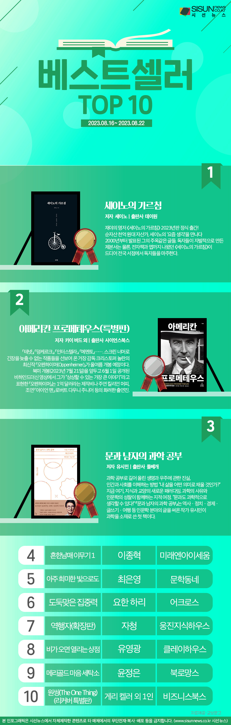 시선뉴스=김선희 proㅣ이번 주에는 어떤 책들이 독자들의 사랑을 받았을까요? 교보문고에서 2023년 08월 16일부터 08월 22일까지 영업점과 인터넷에서 도서와 eBook을 합산해 1주일 간 가장 많이 판매된 책 순위를 발표했습니다.