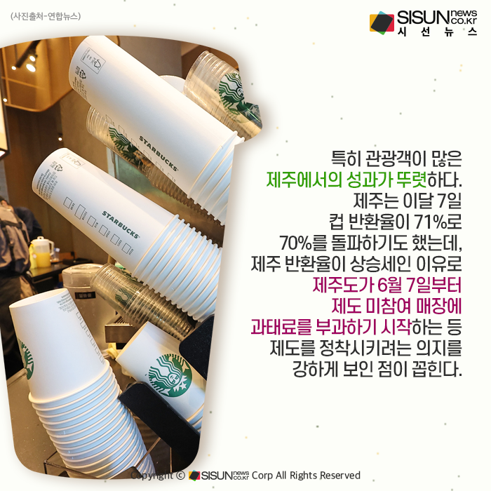 특히 관광객이 많은 제주에서의 성과가 뚜렷하다. 제주는 이달 7일 컵 반환율이 71%로 70%를 돌파하기도 했는데, 제주 반환율이 상승세인 이유로 제주도가 6월 7일부터 제도 미참여 매장에 과태료를 부과하기 시작하는 등 제도를 정착시키려는 의지를 강하게 보인 점이 꼽힌다.