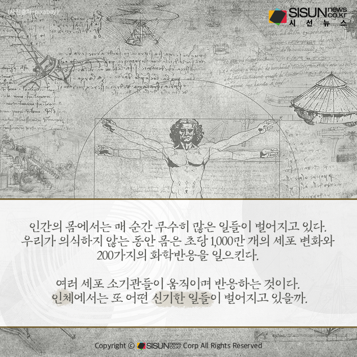 시선뉴스=정혜인 기자ㅣ인간의 몸에서는 매 순간 무수히 많은 일들이 벌어지고 있다. 우리가 의식하지 않는 동안 몸은 초당 1,000만 개의 세포 변화와 200가지의 화학반응을 일으키고 있다. 세포질, 리소좀, 미토콘드리아 등의 세포 소기관들이 움직이며 반응하는 것이다. 인체에서는 또 어떤신기한 일들이 벌어지고 있을까.