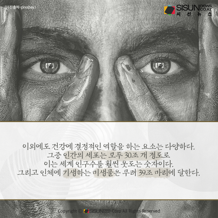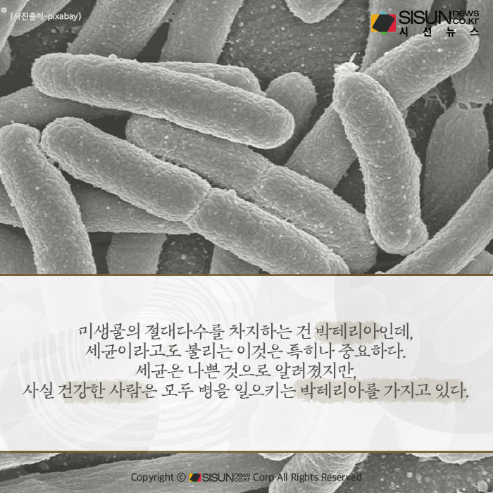 이외에도 건강에 결정적인 역할을 하는 요소는 다양하다. 그중 인간의 세포는 모두 30조 개 정도로 이는 세계 인구수를 훨씬 웃도는 숫자이다. 그리고 인체에 기생하는 미생물은 무려 39조 마리에 달한다. 미생물의 절대다수를 차지하는 건 박테리아인데, 세균이라고도 불리는 이것은 특히나 중요하다.
