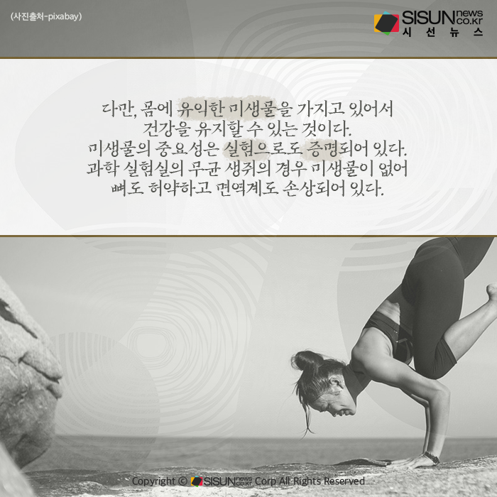 세균은 나쁜 것으로 알려졌지만, 사실 건강한 사람은 모두 병을 일으키는 박테리아를 가지고 있다. 다만, 몸에 유익한 미생물을 가지고 있어서 건강을 유지할 수 있는 것이다. 미생물의 중요성은 실험으로도 증명되어 있다. 과학 실험실의 무균 생쥐의 경우 미생물이 없어 뼈도 허약하고 면역계도 손상되어 있다.