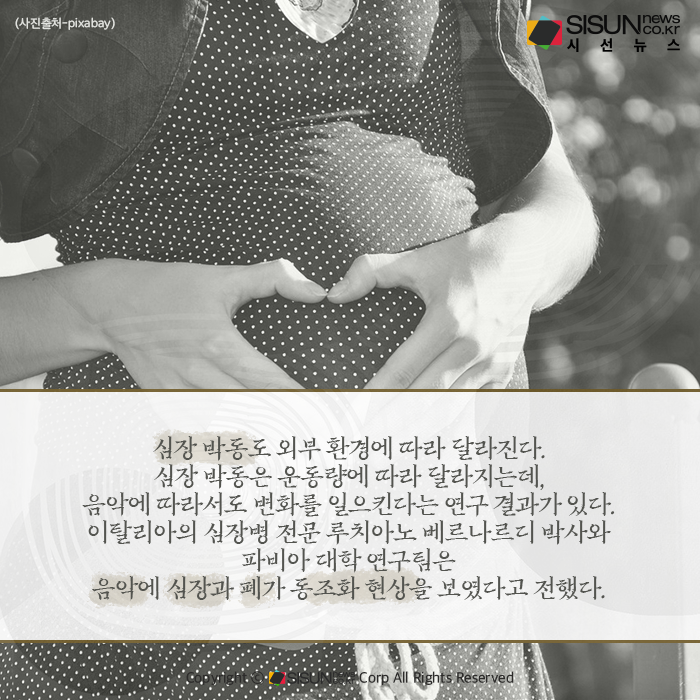 심장 박동도 외부 환경에 따라 달라진다. 심장 박동은 운동량에 따라 달라지는데, 음악에 따라서도 변화를 일으킨다는 연구 결과가 있었다. 이탈리아의 심장병 전문 루치아노 베르나르디 박사와 파비아 대학 연구팀은 음악에 심장과 폐가 동조화 현상을 보였다고 전했다. 베르나르디 박사는 “음악은 심장혈관계에 지속적인 역동성을 만들어 내고, 어느 정도는 예측 가능한 변화를 만들어 낸다”고 말했다.