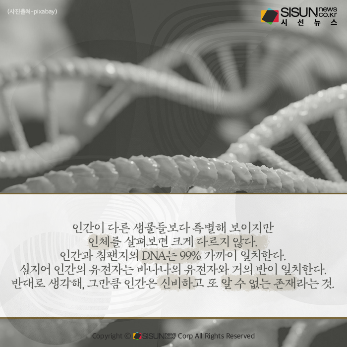 인간이 다른 생물들보다 특별해 보이지만 인체를 살펴보면 크게 다르지 않다. 인간과 침팬지의 DNA는 99% 가까이 일치한다. 심지어 인간의 유전자는 바나나의 유전자와 거의 반이 일치한다. 반대로 생각해 그만큼 인간은 신비하고 또 알 수 없는 존재라는 것. 인간은 지금까지 다양하게 활동하며 여러 문화를 만들었지만, 이는 처음부터 다른 생물과 달라서가 아니라 후천적으로 변화해 왔기 때문이라고 할 수 있다.