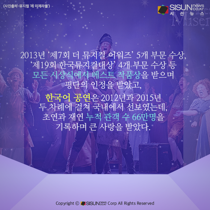 시선뉴스=박진아 기자 / 디자인=김선희 proㅣ하반기 기대작 뮤지컬 '레 미제라블'이 10년 만의 공연이자, 공연 첫 도시 부산에서 개막 후 명성에 걸맞은 무대라는 호평받고 있다. ‘레 미제라블(Les Misérables)’은 프랑스어로, 우리말로는 ‘불쌍하고 가련한 사람들’이란 뜻으로 빅토르 위고의 ‘레 미제라블’에서는 인간을 소외시키는 사회제도에 저항하는 사람들의 이야기를 담고 있다.