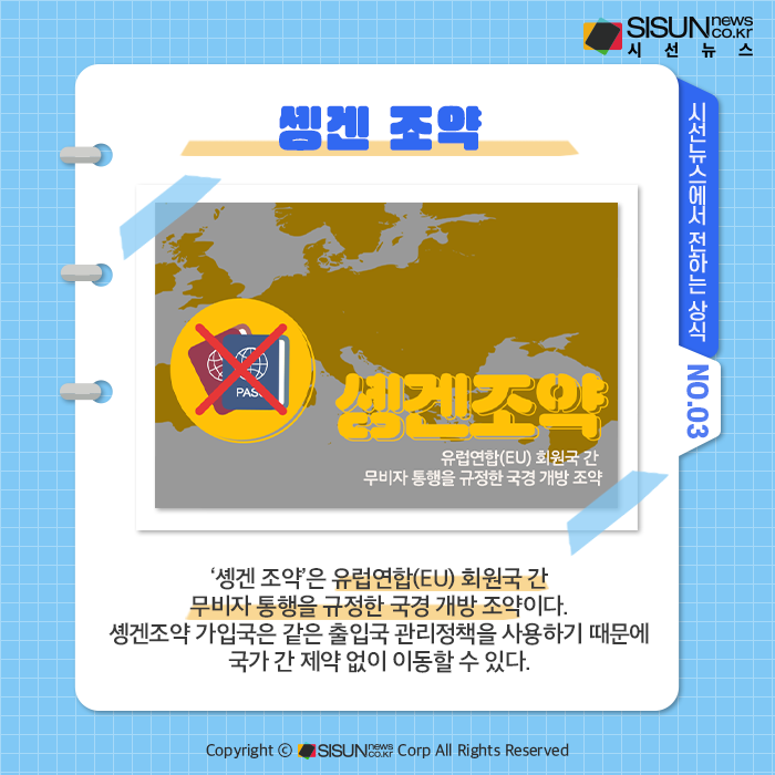 ‘솅겐 조약’은 유럽연합(EU) 회원국 간 무비자 통행을 규정한 국경 개방 조약이다. 솅겐조약 가입국은 같은 출입국 관리정책을 사용하기 때문에 국가 간 제약 없이 이동할 수 있다. 이름의 유래로는 1985년 룩셈부르크 남부 솅겐에서 독일·프랑스·네덜란드·벨기에·룩셈부르크 등 5개국이 처음으로 체결해 ‘솅겐 조약’으로 불리며 1990년 일부 개정을 거쳐 1995년 효력이 발효됐다.
