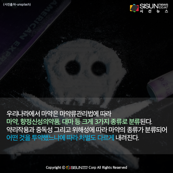 우리나라에서 마약은 마약류관리법에 따라 마약 / 향정신성의약품 / 대마 등 크게 3가지 종류로 분류된다. 약리작용과 중독성 그리고 위해성에 따라 마약의 종류가 분류된 만큼, 어떤 것을 투약했느냐에 따라 처벌도 다르게 내려진다.