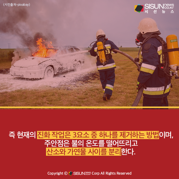 과연 소방에는 어떤 과학이 적용될까? 화재를 예방하기 위해서는 우선 화재가 어떻게 일어나는지 알아야 한다. 화재는 발화점 이상의 온도(점화원), 산소, 가연물이 필요한데, 이 세 가지 중 하나라도 없게 되면 불은 꺼진다는 의미다.
