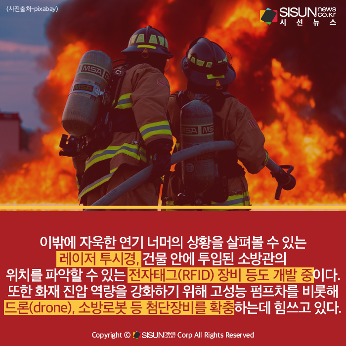 이밖에 자욱한 연기 너머의 상황을 살펴볼 수 있는 레이저 투시경, 건물 안에 투입된 소방관의 위치를 파악할 수 있는 전자태그(RFID) 장비 등도 개발 중이다. 또한 화재 진압 역량을 강화하기 위해 고성능 펌프차를 비롯해 드론(drone), 소방로봇 등 첨단장비를 확충하는데 힘쓰고 있다.