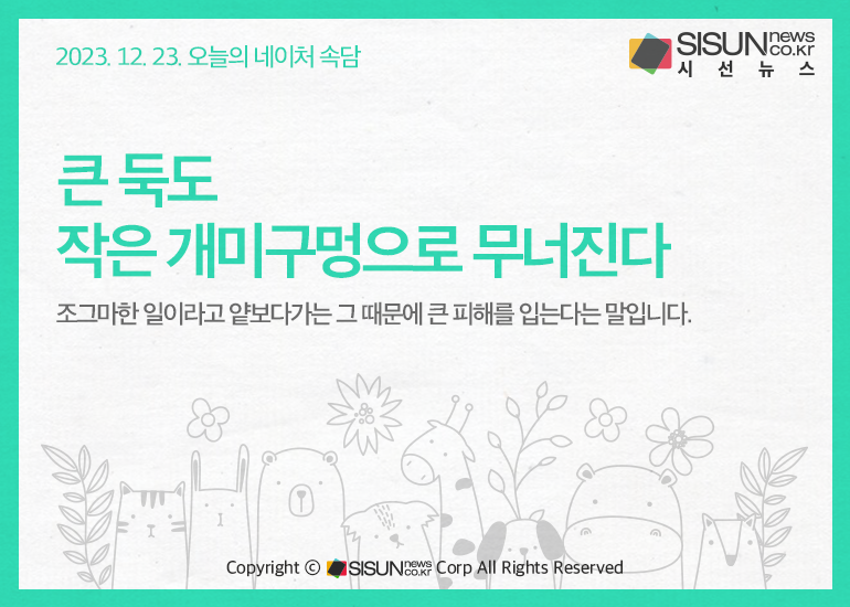오늘의 네이처속담은 <큰 둑도 작은 개미구멍으로 무너진다>입니다.