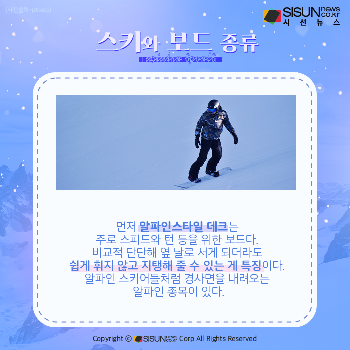 시선뉴스=양원민 기자 / 디자인=김선희 proㅣ기온이 영하로 떨어지며 국내 스키장들이 개장 준비에 나서고 있다. 우리나라는 국토는 넓지 않지만 산간 지역이 많아 스키장이 잘 되어 있는데, 원시적 스키는 수천 년 전에 이미 고안되었고 북유럽 스칸디나비아반도에선 일찍부터 겨울철 교통수단으로 이용했다고 한다. 겨울철 대표적인 스포츠인 스키와 보드의 종류엔 무엇이 있을까?