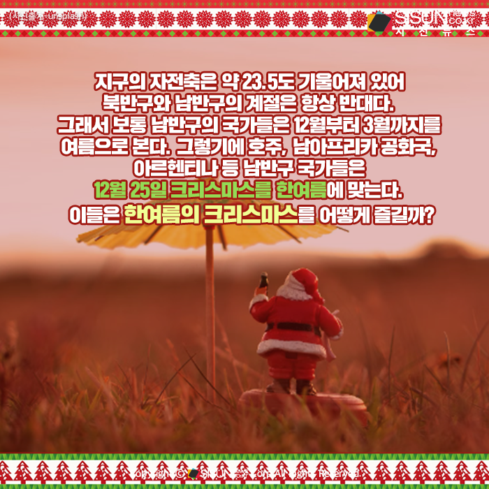 시선뉴스=양원민 기자ㅣ지구의 자전축은 약 23.5도 기울어져 있어 북반구와 남반구의 계절은 항상 반대다. 그래서 보통 남반구의 국가들은 12월부터 3월까지를 여름으로 본다. 그렇기에 호주, 남아프리카 공화국, 아르헨티나 등 남반구 국가들은 12월 25일 크리스마스를 한여름에 맞는데, 이들은 한여름의 크리스마스를 어떻게 즐길까?